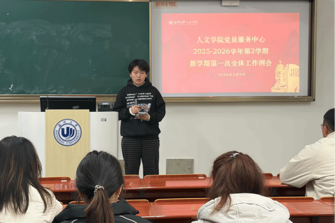 为明确新学期工作方向,凝聚青年力量,财神捕鱼 党员服务中心于2026年3月9日晚上在人文楼207教室召开本学期第一次全体工作例会。本次会议由主任吴嘉洁主持,各部长及干事参会,杨凯老师出席会议并作总结讲话。