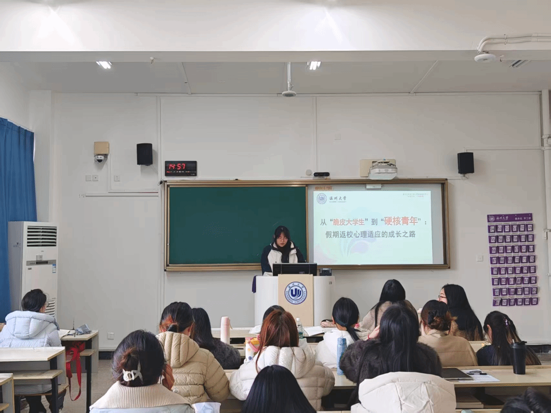 为帮助学生走出 “脆皮” 困境,班会分享了规律作息、拆分目标、运动减压等实用调适方法,还详细介绍了财神捕鱼 心理健康中心、朋辈心理辅导、24 小时心理热线等支持渠道,让学生知道 “脆皮” 有靠山,遇到困惑可及时寻求专业帮助。从情绪管理到压力应对,从人际交往到自我关怀,一系列心理疏导内容让学生学会以积极心态拥抱新学期。