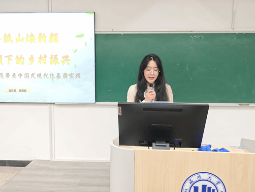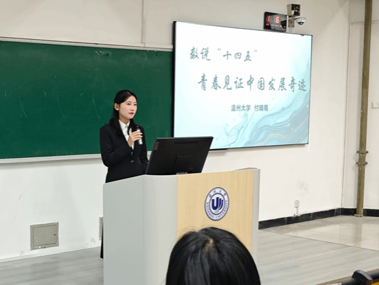 宣讲人付晴雨则以“数说‘十四五’:海岛上的发展奇迹”为题,分享乡村的实践见闻,从智能养殖的科技突破到社区的温情服务,诠释国家战略在基层的生动落地,并呼吁青年将个人奋斗融入时代蓝图。