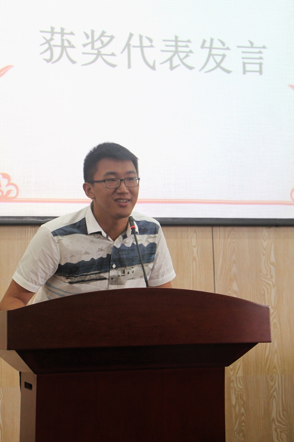 大学生的写作经历中,留下了韫玉含辉的一笔,托起了学子们的写作梦。接下来,获奖者们上台领奖并合影留念,鲜红的奖状是对同学们写作最好的鼓舞。之后,一等奖获得者13中本储展鹏代表获奖同学上台发言。他谈到,我们在人生中应读三本书,首先是有字之书,即阅读量的积累;其次是无字之书,要用于去远方,去认识更多的人,找到属于自己的路;还有心灵之书,要找到自己的信仰,坚持一路激情、矢志不渝。朱闻武先生也进行了饱含感慨的发言。他说,白晖华文学奖发掘了有才华的年轻人们,这个奖项也是同学们青春中很有成就感的事情。奖项发起人吴明华先生是优秀的作家和经商者,白晖华也是其对文学教育事业的关注与热爱最好的见证。这十年来,岁月轮转,文学奖能延续下来十分可贵。这得益于吴先生对其的呵护与珍惜,也离不开温大校方的重视与培育。文学的梦想是本无字之书,是一切艺术的母体,愿文学事业发展源远流长。