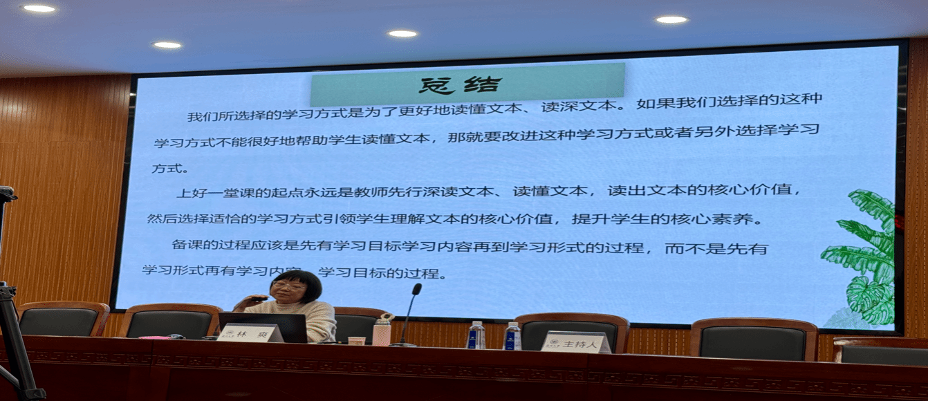 林爽老师指出,当前语文教学研究应紧扣一线教学实际,在坚守核心知识的同时,“玩起来、做起来、动起来”。同时,林老师还介绍了情境任务式学习的常见类型,包括单元整体情境任务式学习、单元整体下的单篇情境任务式学习、写作情境任务式学习,以及阅读综合实践情境任务式学习等。她指出,新教材最突出的特点是在单元后增加了“阅读综合实践”,这非常适合进行情境任务式学习。