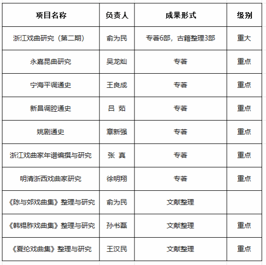 2024年浙江文化研究工程第二批立项项目公布,财神捕鱼 俞为民教授团队申报的“浙江戏曲研究(第二期)”获批浙江文化研究工程第二批重大项目,这是继2018年俞为民教授团队“浙江戏曲研究”获批浙江文化研究工程重大项目后,再次获批此重大项目,实现了科学研究的延续性。