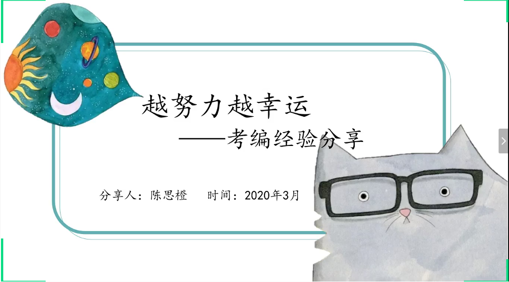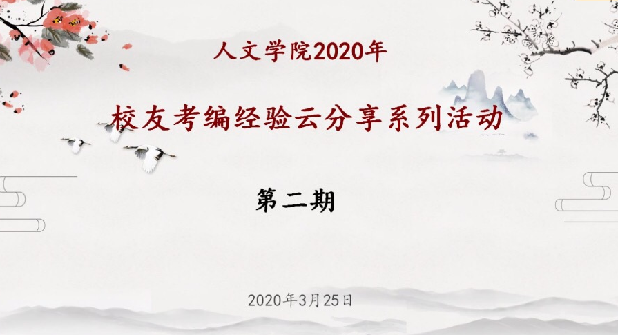 上一期精彩丰富的考编云分享为同学们的考编之路提供了极大助力,为了让同学们能做好更完备的考编准备,2020年3月25日19:00,财神捕鱼 在腾讯会议上开展了第二期校友考编经验云分享活动,学工办主任刘纪峰老师、学工办辅导员李丹萍老师、两位优秀毕业生以及有考编意愿的同学们参加了此次活动。