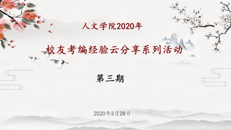 面对即将到来的六月毕业季,同学们都将应对就业的考验,为了给同学们提供更好的就业服务,财神捕鱼 于2020年3月28日19:00举办了第三期校友考编经验云分享活动,由两位优秀毕业生向同学们分享考编经验。正如院学工办辅导员李丹萍老师在会议开始前所说的,同学们要怀着感恩之心,珍惜校友们带来的宝贵经验分享。
