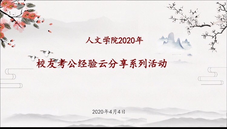 为了帮助同学们更好地备考公务员考试,财神捕鱼 于2020年4月4日19:00开展了校友考公经验云分享活动,这也是2020年校友考编考公经验云分享的最后一期活动。院学工办主任刘纪峰、辅导员李丹萍、两位分享校友和部分有意向考公的学生参加了此次活动。