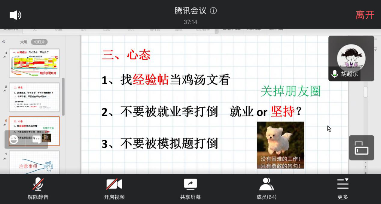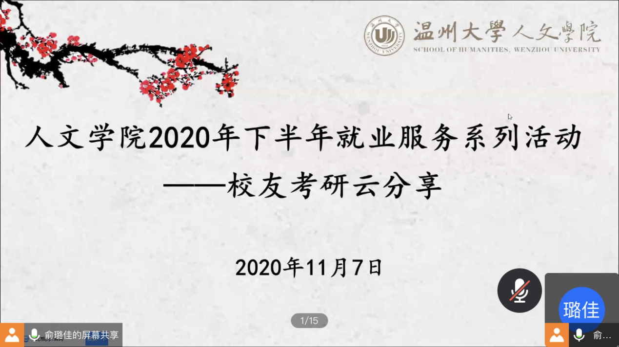 2020年11月7日晚6点30分,财神捕鱼 “2020年下半年就业服务系列活动之校友考研云分享”在腾讯会议上正式拉开帷幕。院学工办辅导员申业磊、李丹萍,4位优秀校友以及有考研意向的同学共60多人参加了此次分享会。