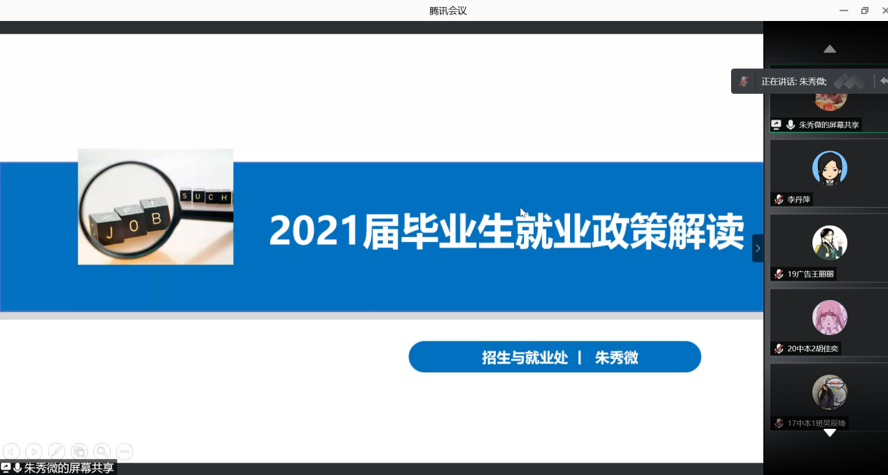 大会伊始,朱秀微老师对2021届毕业生就业政策进行解读。她以案例导入,分析了目前的就业形势,如受疫情影响仍具有不确定性、“高期望”“慢就业”加剧等。随后具体解读了国家相关的就业创业政策,她推荐同学们可以到新职业网了解相关就业信息。关于大学生就业补贴问题,朱老师分享了温州市510政策,并将浙江省各地的大学生就业补贴做对比,使同学们能够更加直观地了解。
