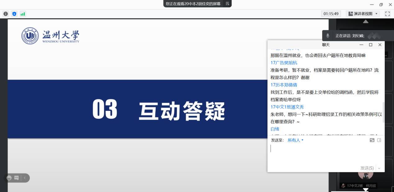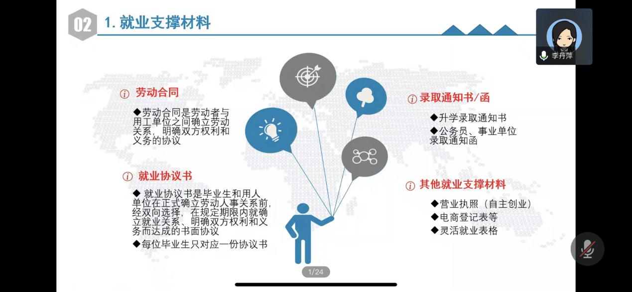 会上,李丹萍老师对就业手续和流程进行讲解,详细介绍了关于就业支撑材料、就业协议书、就业方案确认、报到证、档案与户籍五个方面的具体内容及要求,并且提醒同学们注意就业安全:在求职过程中,要注意信息甄别,面试要选择正规渠道,警惕网络面试陷阱。在互动答疑环节,同学们就档案转递、就业材料、就业补贴等方面提出疑问,老师们逐一耐心解答。