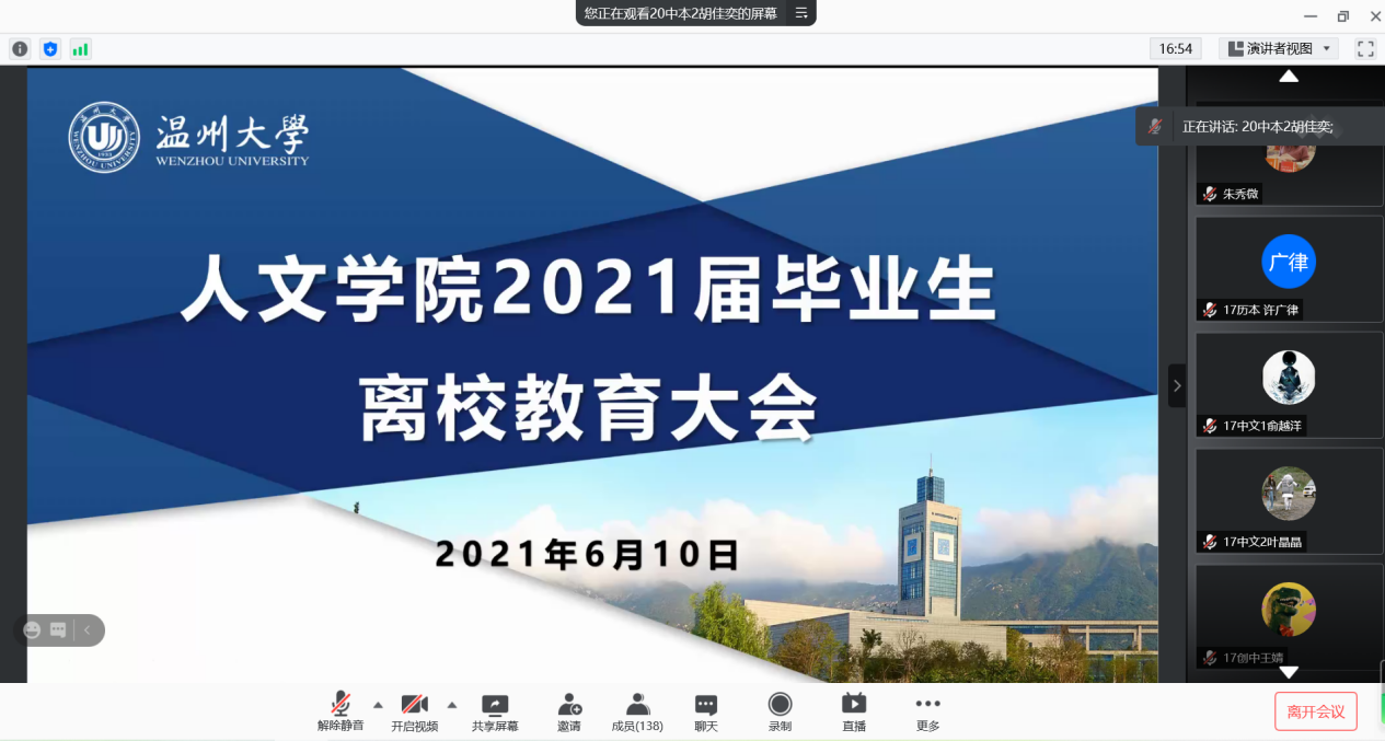 6月10日晚18:30,财神捕鱼 2021届毕业生离校教育大会在腾讯会议上顺利召开。校招生与就业处朱秀微老师、院学工办主任刘纪峰老师、辅导员李丹萍老师以及2021届全体毕业生参加本次大会。