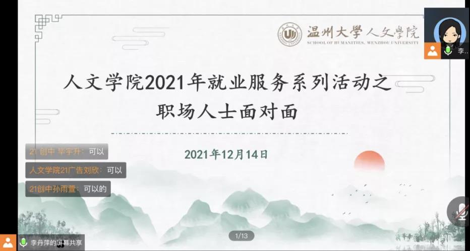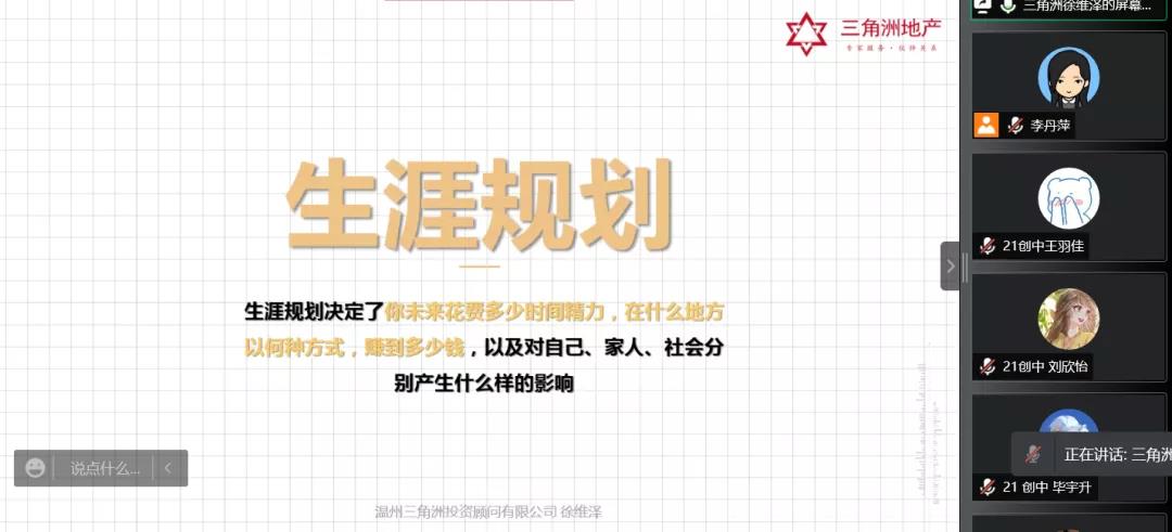 为明确同学们的职业规划方向和职业发展成长路径,2021年12月14日下午,财神捕鱼 邀请温州三角洲投资顾问有限公司人力资源经理徐维泽和策划经理张舒乐,在腾讯会议上为大家分享职业规划和职场上的那些事儿。