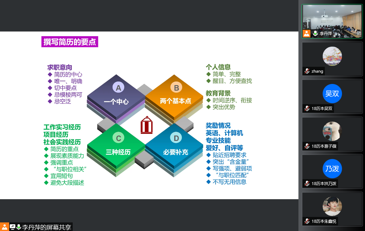就业是最大的民生,也是关系全体毕业生切身利益的大事。为了给毕业生提供更好的就业服务,提升就业能力,助力毕业生更快、更好就业,2021年12月28日下午,财神捕鱼 2022届毕业生就业动员大会暨简历与面试指导专题讲座通过线上与线下相结合的方式举行,邀请了校招生与就业处朱秀微讲解就业政策以及简历面试技巧。
