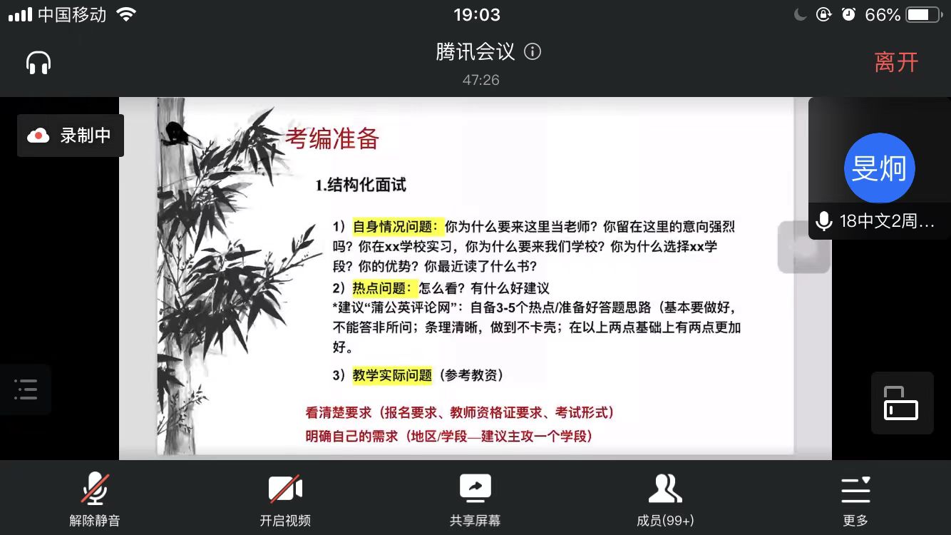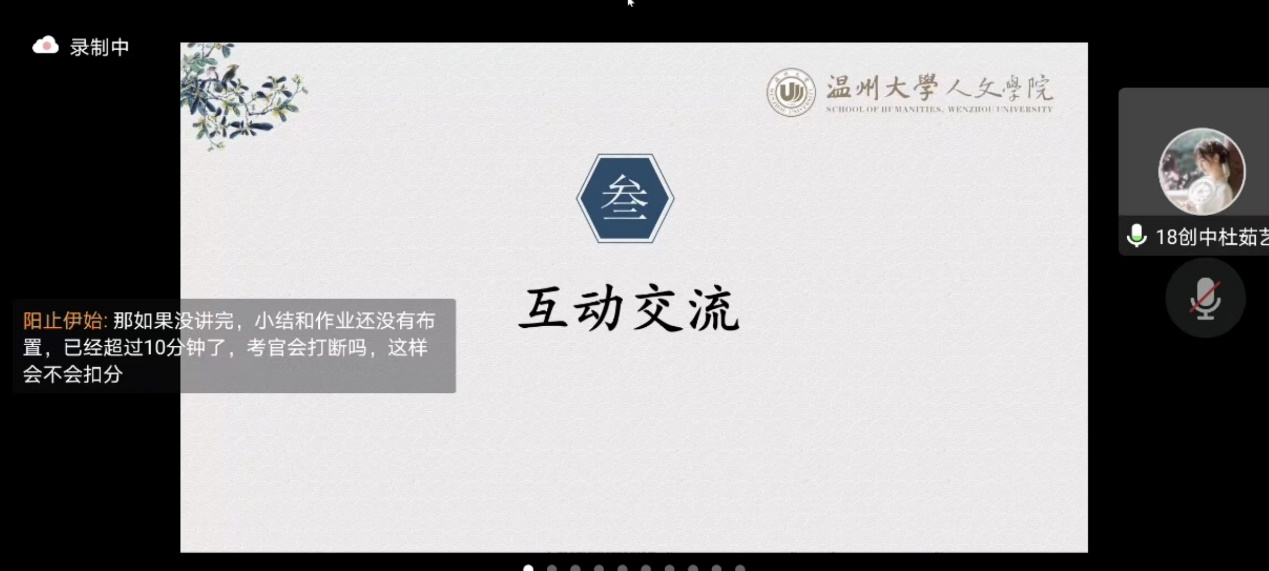 18中文1班周银浩学长就教师招聘流程、结构化面试、笔试、试讲、考编到底难不难五个方面展开经验分享。对于笔试、试讲越来越灵活的问题,学长表示我们应加深对课文的熟悉和理解,以最好的姿态来迎接挑战。18中文2班周旻炯学姐建议大家应先明确自己的基本情况,再进行精准的信息筛选。在考编准备方面,学姐分享了结构化面试的优胜技巧以及试讲中亮点呈现的方法。她强调,在备考中一定要反复阅读教参,将其读熟、读透,同时要注意心态的调整。18创意中文杜茹艺学姐围绕“信息战”、拼命努力、心态调整三方面内容展开分享。在信息战方面,学姐建议组队备考、信息共享。学姐说道:“要有考第一的野心并付出十分努力”、“养兵千日,用兵一时”、“道阻且长,行则将至”。18历史(师范)陈如意学姐就仪容教态、待人接物、语言表达等方面的面试增分细节进行分享。对于模拟上课,学姐还分享了A4教学设计法,希望能对同学有所帮助。