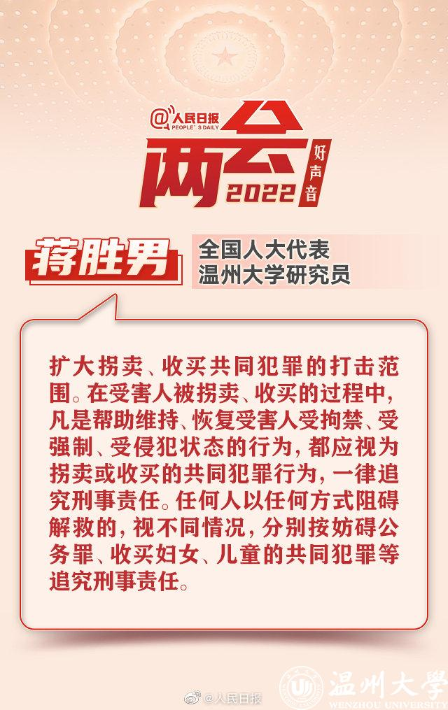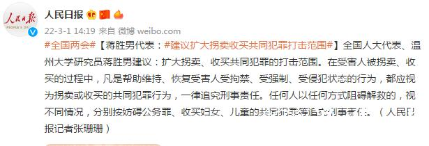 【蒋胜男代表:#建议扩大拐卖收买共同犯罪打击范围#】全国人大代表、财神捕鱼 研究员蒋胜男建议:扩大拐卖、收买共同犯罪的打击范围。在受害人被拐卖、收买的过程中,凡是帮助维持、恢复受害人受拘禁、受强制、受侵犯状态的行为,都应视为拐卖或收买的共同犯罪行为,一律追究刑事责任。任何人以任何方式阻碍解救的,视不同情况,分别按妨碍公务罪、收买妇女、儿童的共同犯罪等追究刑事责任。(人民日报记者张珊珊)