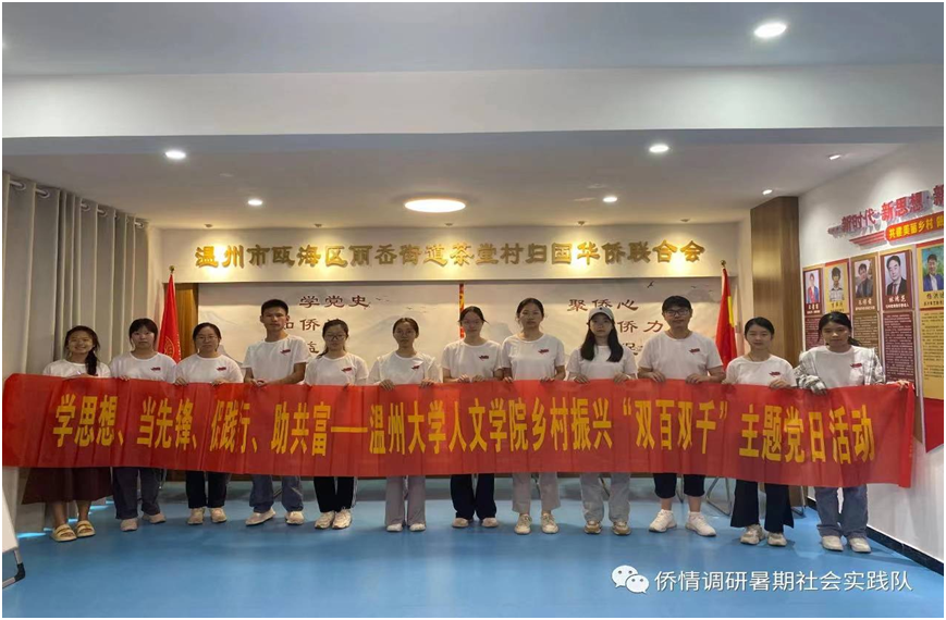 与此同时,财神捕鱼 侨心向党暑期社会实践队全体成员开始了侨情调研暨“双百双千”主题党日活动。实践队深入温州传统侨乡丽岙,仙岩,围绕华侨文化进行实地调研与社会实践。青山绿水之间,侨乡百姓招呼着远道而来的亲人、旅人、客人,脸上洋溢着共富与幸福的笑容。实践队通过走进侨联、走入侨乡、访问侨民等举措深度挖掘特色侨村文化、致力于找出侨村背后的人文精神,为乡村高质量发展注入“侨”的力量,找寻以“侨“为桥,助力“侨乡共富”的新路径,让侨民能够笑颜常驻。