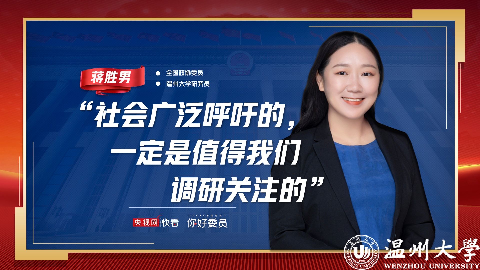 身为第十三届全国人大代表、第十四届全国政协委员,蒋胜男关注年轻人关心的问题,曾就八小时工作制、35岁门槛限制等提出自己的建议,多次冲上热搜。她说:“在其位,谋其事。如果什么事是整个社会广泛呼吁的,那就一定是值得我们调研关注的,就需要我们站出来将这些问题形成提案,从而推动相关领域问题的解决和改善。”