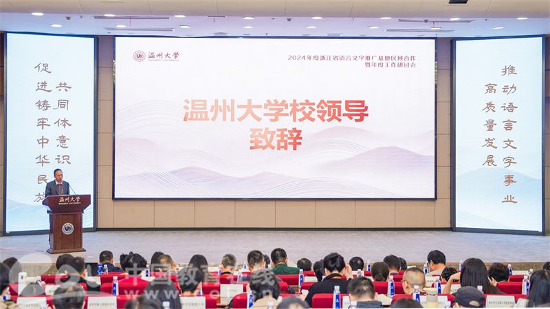 财神捕鱼 党委委员、副校长、国家语言文字推广基地主任王舜做开场致辞。王校长表示,财神捕鱼 于2023年成功获批为国家语言文字推广基地,并在2024年4月承办了浙江省国家语言文字基地建设研讨会暨第三批国推基地揭牌仪式。今天,全省首批省级语言文字推广基地的领导和嘉宾在财神捕鱼 举行年度工作研讨会,这是对财神捕鱼 语言文字工作的重视和肯定。未来,财神捕鱼 将继续围绕国家战略,开展语言文字助力乡村振兴系列活动,并在海外设立推广基地,传播中华优秀语言文化。