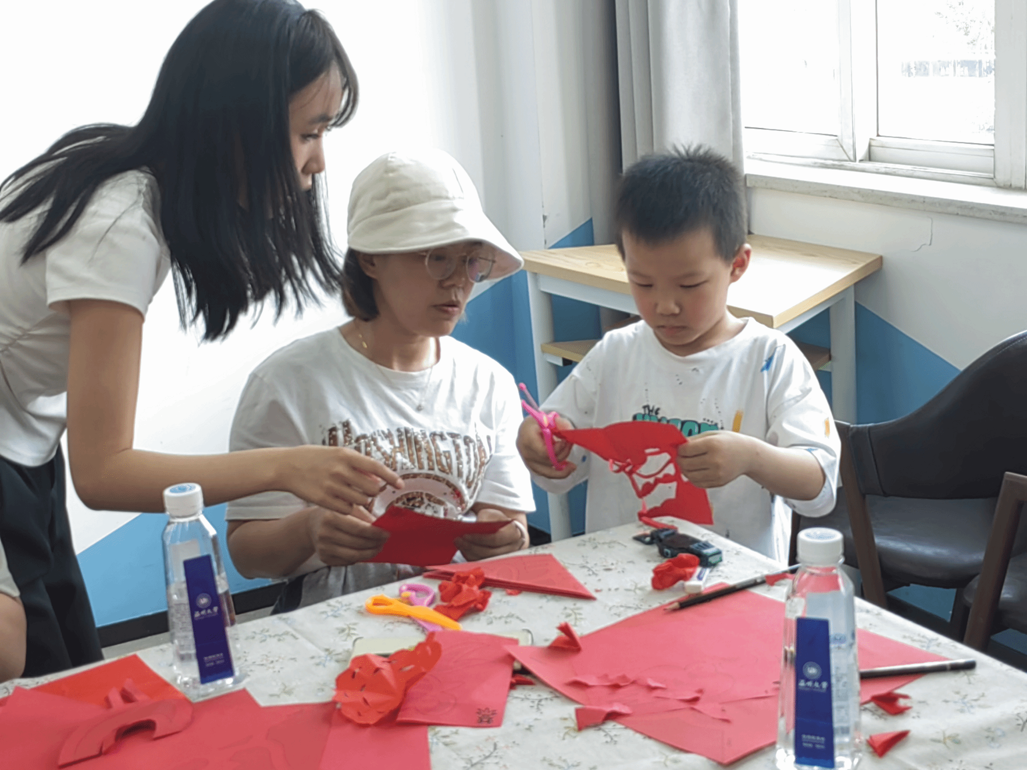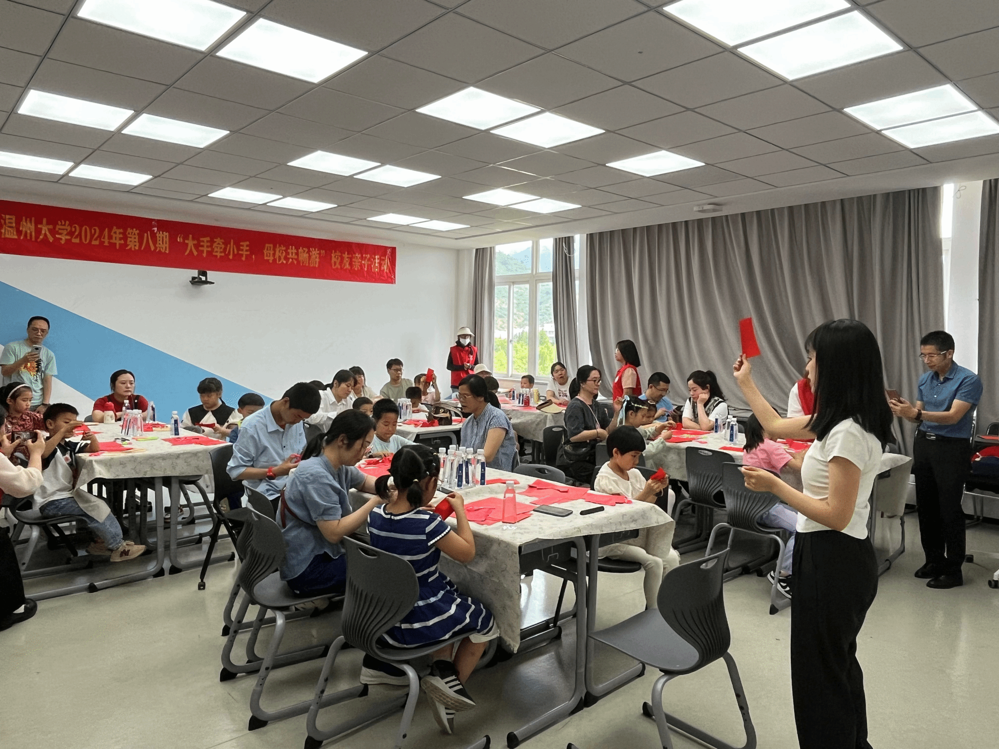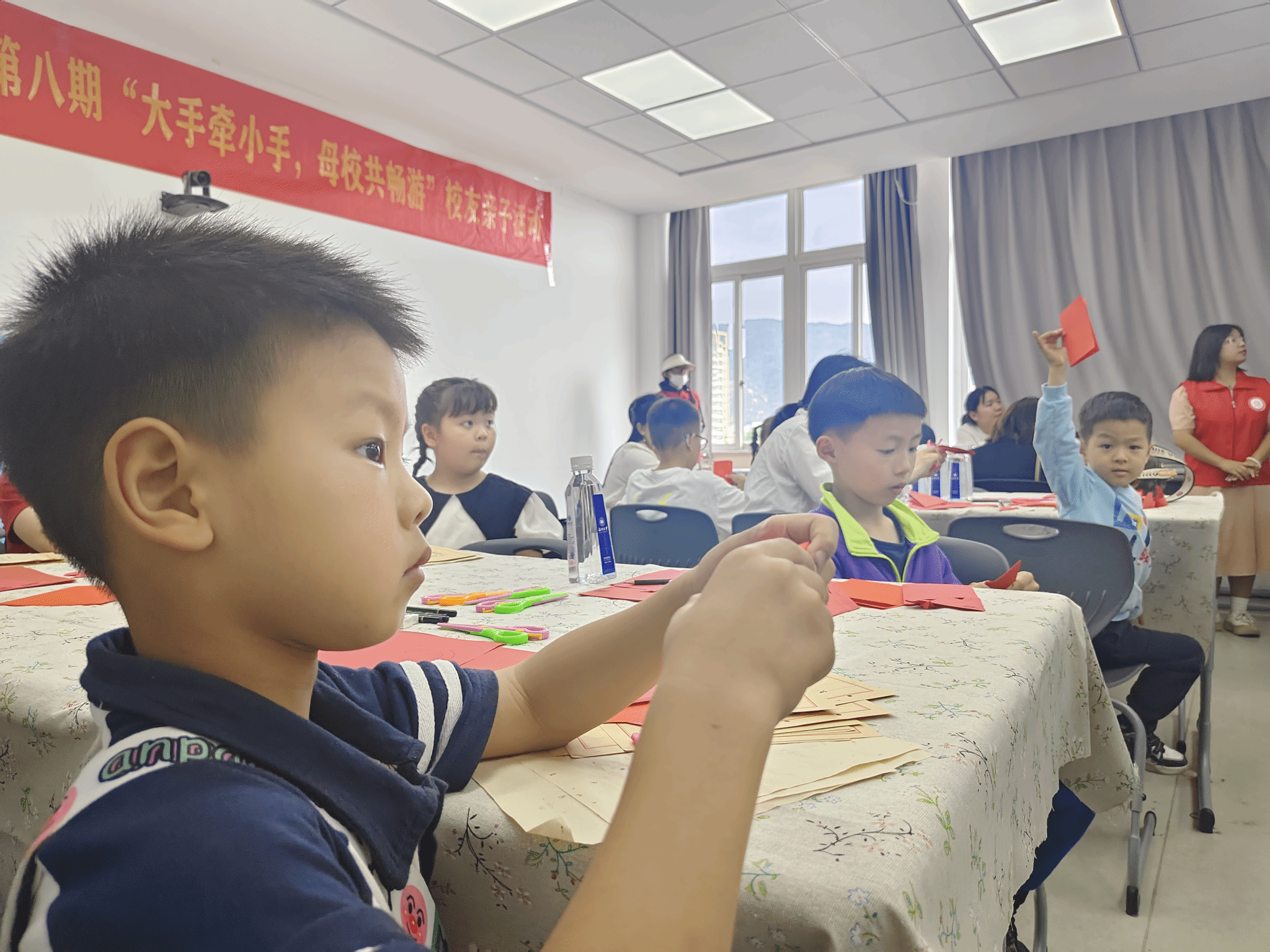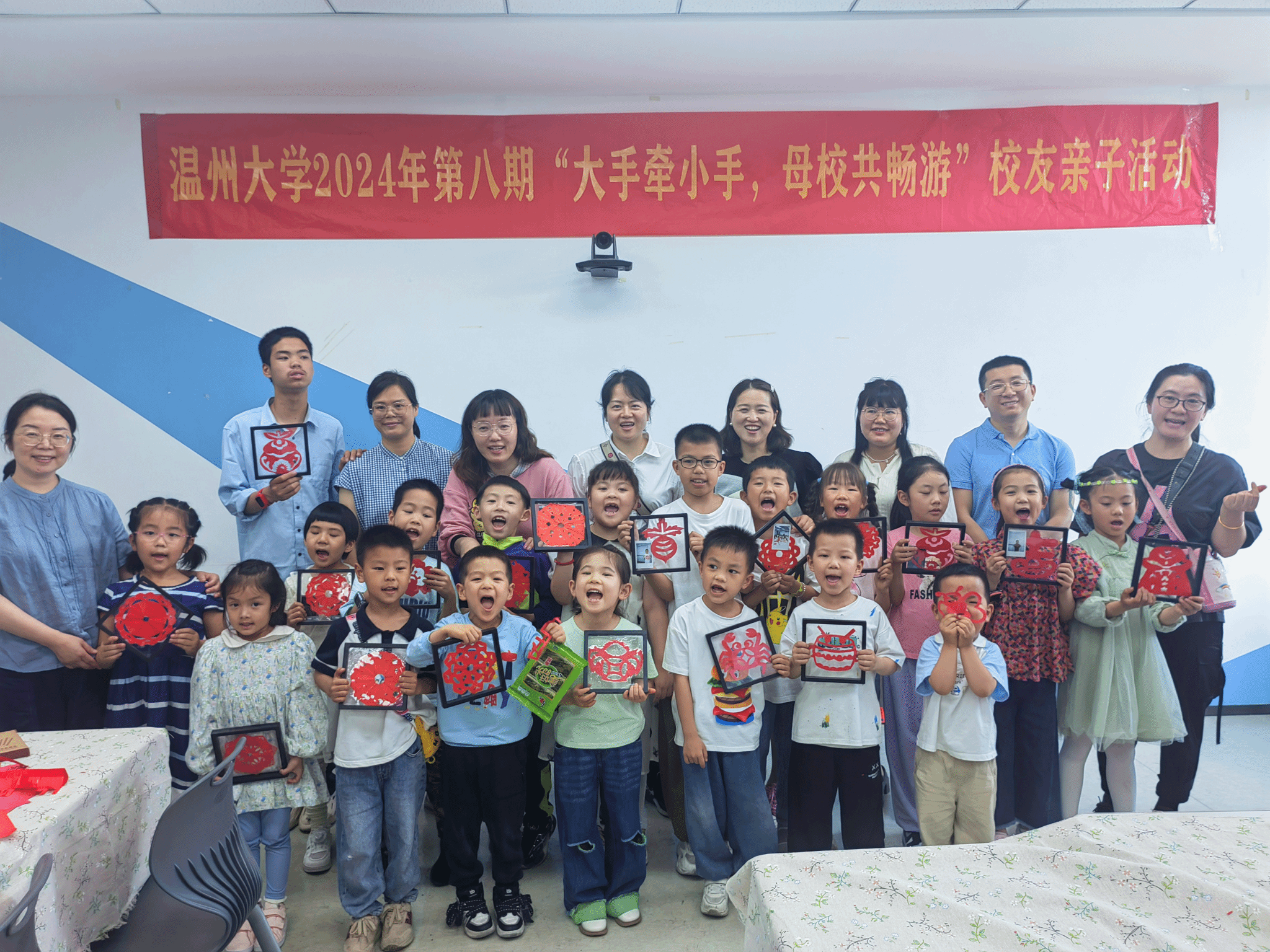亲子活动的最后是一场别开生面剪纸文化实践课,孩子们在老师和家长的指导帮助下,纷纷拿起剪刀和红纸,开始了自己的剪纸创作。从画上纷繁复杂的图案再到剪下红纸上的痕迹,每一个步骤都凝聚着孩子们的专注与热情。他们时而低头挥笔,时而挥动剪刀,教室里充满了欢声笑语,一幅幅精巧的剪纸作品也在小手中慢慢浮现。随着快门声响起,定格下孩子们手持自己创作的剪纸作品,脸上洋溢着自豪和喜悦的笑容的这一刻,也迎来了本次校友亲子活动的圆满结束。