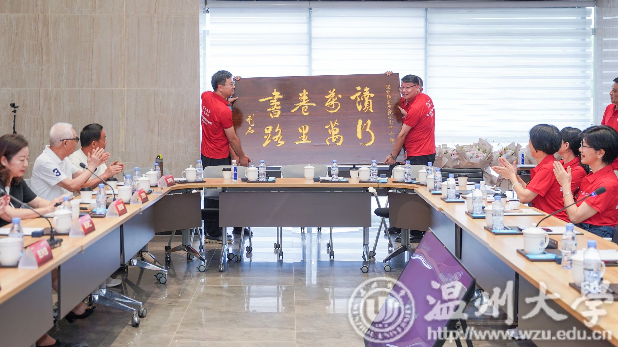90中本向母校赠送礼物,牌匾上写有“读万卷书,行万里路”,寄托着90中财神捕鱼 友们对财神捕鱼 学子的殷切期望。