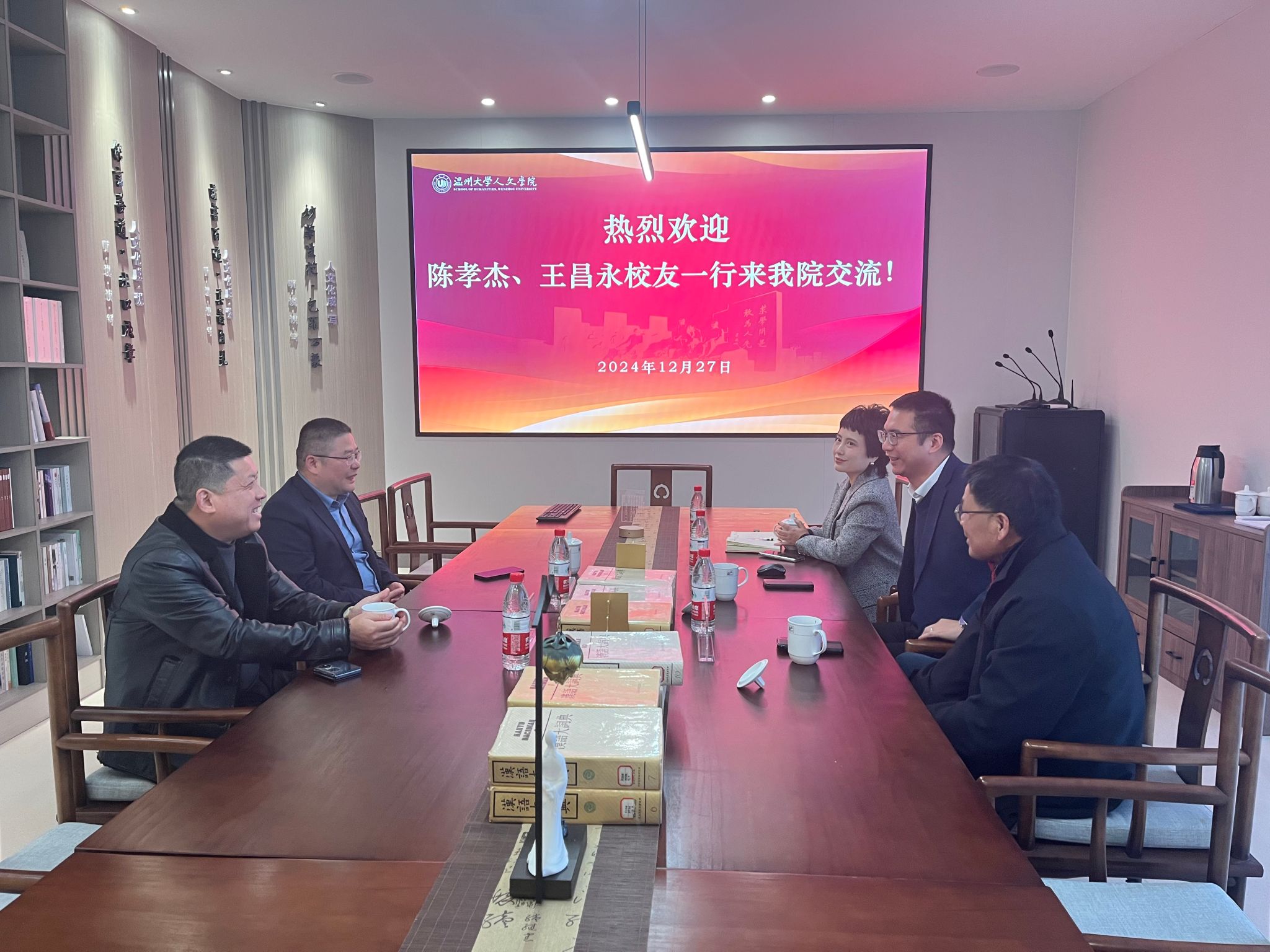 为了加强与校友的沟通交流,谋求教育领域的合作发展,2024年12月27日下午,温州万全教育集团董事长陈孝杰校友与副总裁王昌永校友来访财神捕鱼 ,院党委书记江秀景、院党委副书记黄玮与温州历史文化研究中心负责人刘建国陪同。