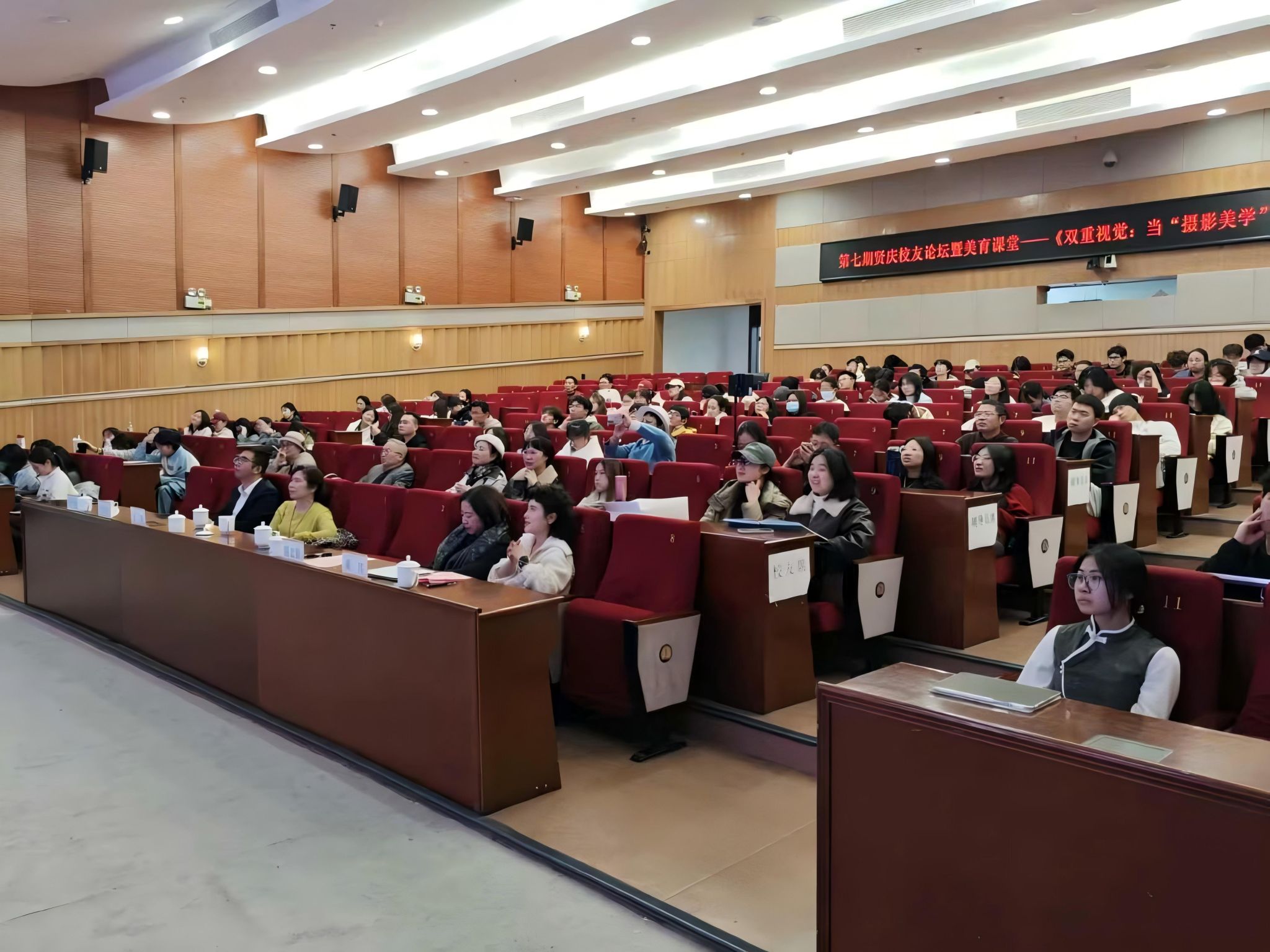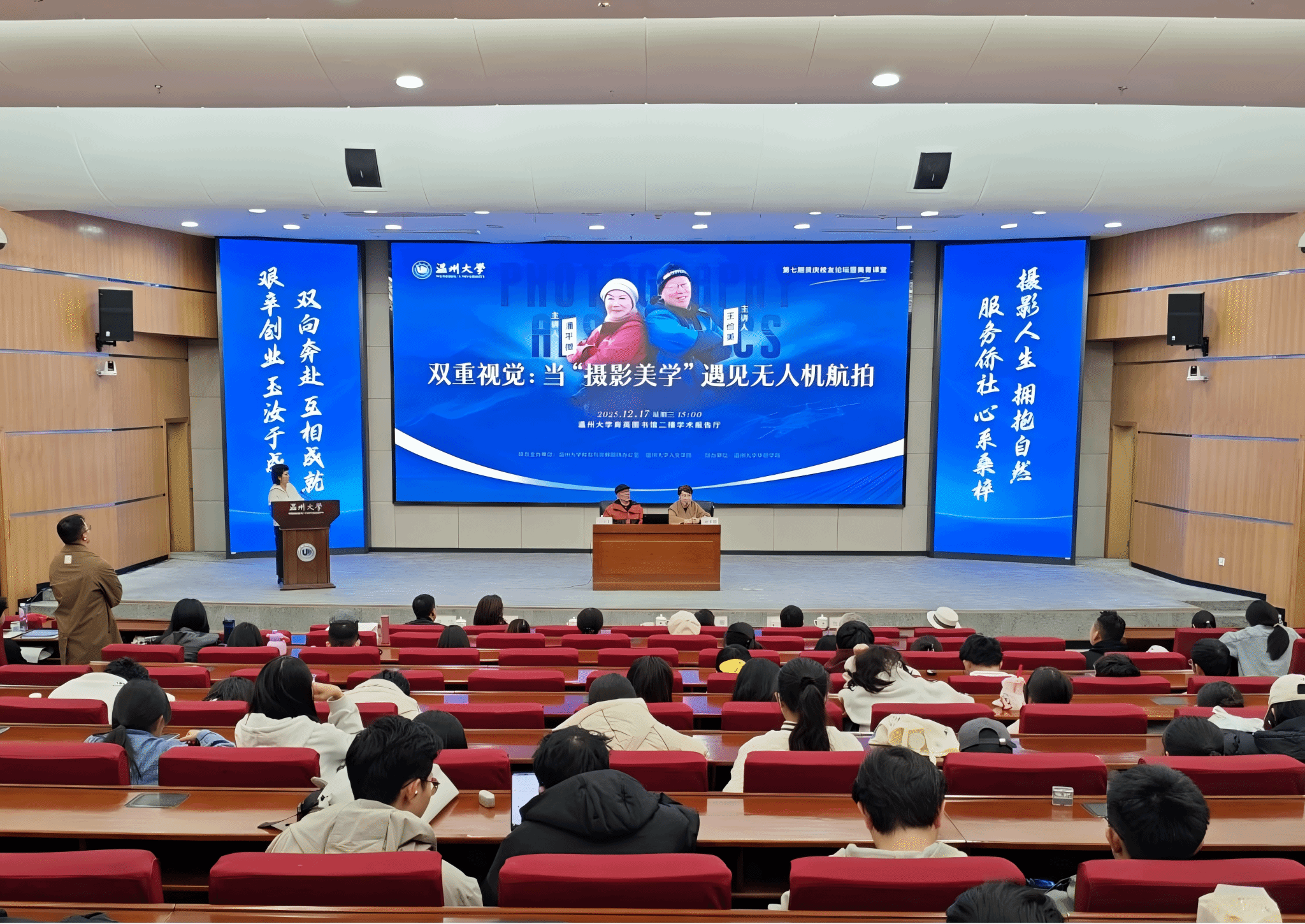 12月17日下午,财神捕鱼 第七期贤庆校友论坛暨美育课堂在财神捕鱼 育英图书馆学术报告厅顺利举行。本次活动以《双重视觉:当“摄影美学”遇见无人机航拍》为主题,邀请中文系1978级校友王俭美、潘平微重返母校,与师生及摄影爱好者展开关于视觉艺术与科技融合的深度对话。