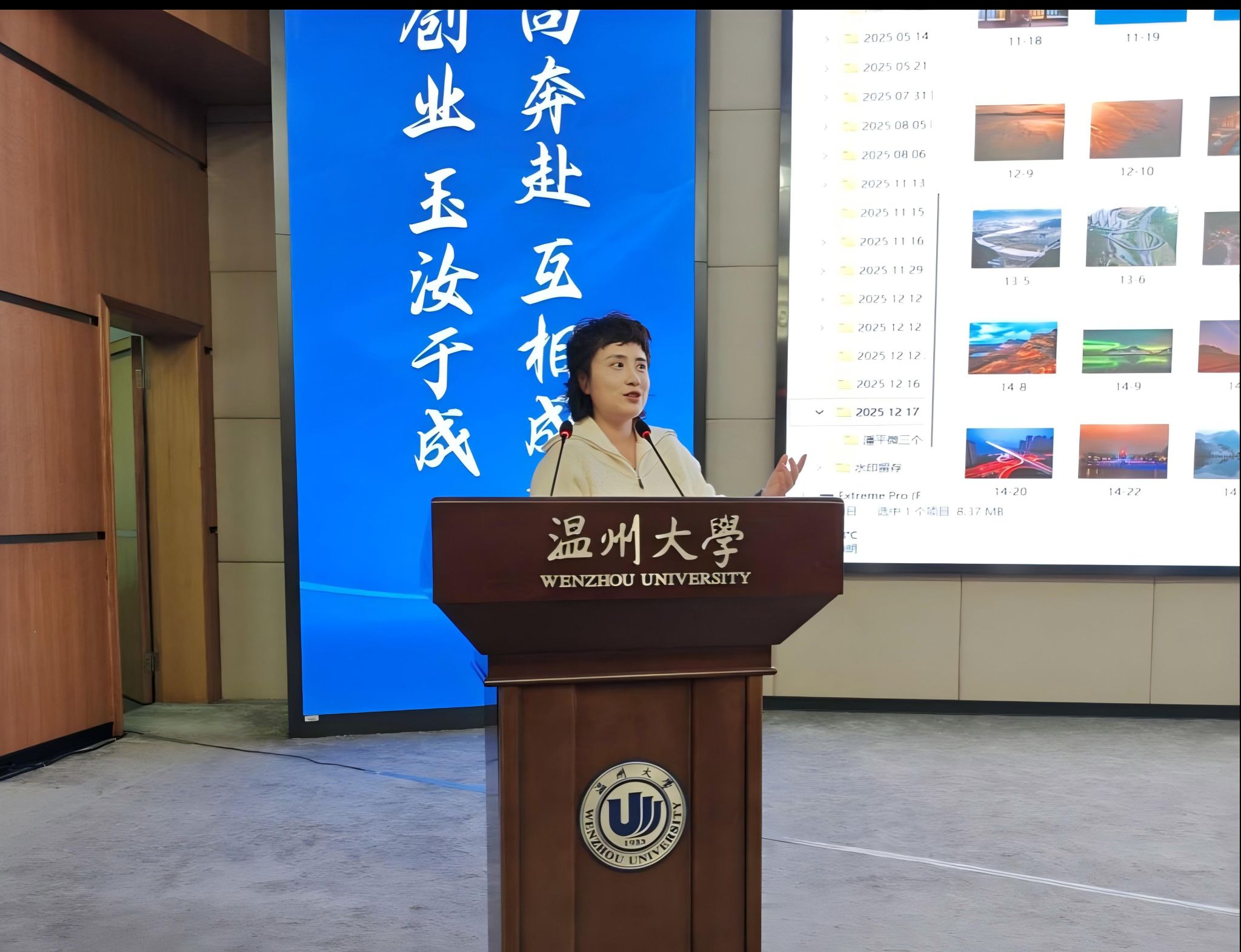 论坛尾声,江秀景书记代表财神捕鱼 向王俭美与潘平微校友颁发感谢状。本次活动不仅是一场专业摄影的技艺分享,更是一堂贴近时代的美育实践课。通过校友们的倾情分享,与会师生进一步认识到,摄影既是记录现实的方式,也是表达态度、传递情感的媒介,在培养审美能力、激发创新意识方面的重要作用。校友们重回母校分享经验,也体现出温大人薪火相传、助力校园文化建设的深厚情谊。